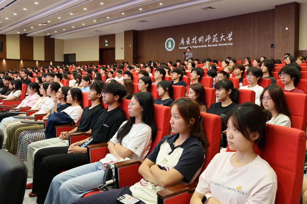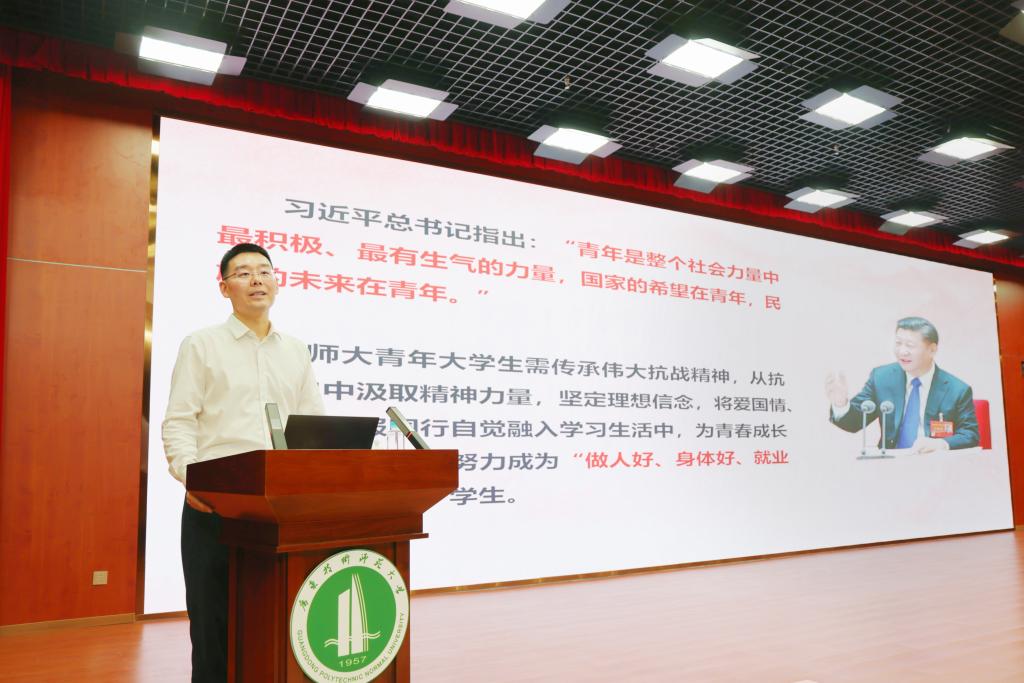 王兵以“历史的回响”为引,系统梳理了中国人民抗日战争的关键节点,并结合校史讲述了学校罗明、汪达之、金伯文等先辈们坚守革命信仰、投身抗战的英勇事迹;以“时代的强音”为脉络,重点解读了习近平总书记在纪念中国人民抗日战争暨世界反法西斯战争胜利80周年大会上的重要讲话精神,并通过王换于、赵一曼以及学校抗战老党员陈冰萍等鲜活案例,阐释伟大抗战精神的核心内涵;以“当下的对话”为对比,王兵带领师生回望80年发展历程,展现了中国在山河面貌、国力提升、民生改善等领域的发展变化。立足学校,王兵详细介绍了学校68年的办学成果与“12366”发展规划,他强调,学校致力于以更加解放的思想、更加高效的工作、更加务实的作风,奋力建设根植湾区、服务全国、走向世界的高水平技术师范大学;以“未来的使命”为寄语,王兵鼓励广师大青年从抗战历史中汲取精神力量,坚定理想信念。